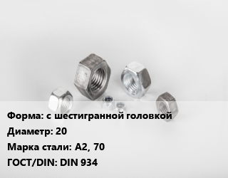 Гайка с шестигранной головкой D=20 Сталь: А2, 70 DIN 934, упаковка 100 шт, нержавеющая сталь цена от 3 734 ₽ / кг, где купить, условия доставки в Туле и Тульской области