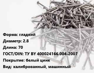Гвоздь гладкий 2.8х70 ГОСТ: ТУ BY 400024166.004-2007 белый цинк калиброванный, машинный