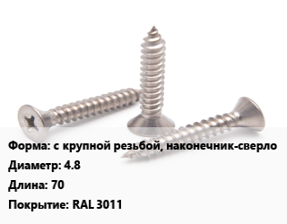 Саморез с крупной резьбой, наконечник-сверло D=4.8 L=70 RAL 3011, шт цена от 2.84 ₽ / кг, где купить, условия доставки в Туле и Тульской области