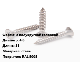 Саморез с полукруглой головкой D=4.8 L=35 сталь RAL 5005, упаковка 3000 шт цена от 3 296 ₽ / кг, где купить, условия доставки в Туле и Тульской области