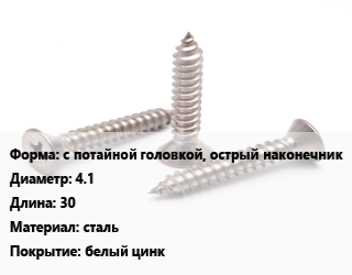 Саморез с потайной головкой, острый наконечник D=4.1 L=30 сталь белый цинк, кг, для оконного профиля цена от 389.89 ₽ / кг, где купить, условия доставки в Туле и Тульской области