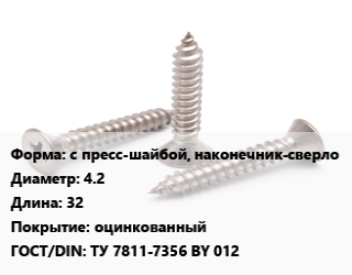 Саморез с пресс-шайбой, наконечник-сверло D=4.2 L=32 оцинкованный ГОСТ: ТУ 7811-7356 BY 012