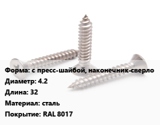 Саморез с пресс-шайбой, наконечник-сверло D=4.2 L=32 сталь RAL 8017, шт цена По запросу где купить, условия доставки в Туле и Тульской области