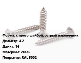 Саморез с пресс-шайбой, острый наконечник D=4.2 L=16 сталь RAL 5002, шт цена По запросу где купить, условия доставки в Туле и Тульской области