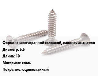 Саморез с шестигранной головкой, наконечик-сверло D=5.5 L=19 сталь оцинкованный, шт цена от 2.07 ₽ / кг, где купить, условия доставки в Туле и Тульской области