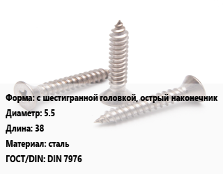Саморез с шестигранной головкой, острый наконечник D=5.5 L=38 сталь ГОСТ: DIN 7976