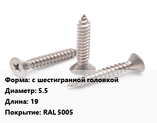 Саморез с шестигранной головкой D=5.5 L=19 RAL 5005, упаковка 10 шт цена от 29.7 ₽ / кг, где купить, условия доставки в Туле и Тульской области