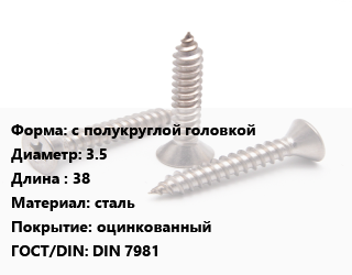 Саморез с полукруглой головкой D=3.5 L=38 сталь оцинкованный ГОСТ: DIN 7981