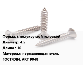 Саморез с полукруглой головкой D=4.5 L=16 нержавеющая сталь ГОСТ: ART 9048