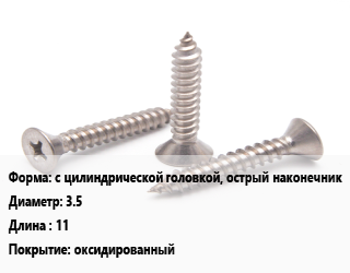Саморез с цилиндрической головкой, острый наконечник D=3.5 L=11 оксидированный, упаковка 20000 шт цена от 3 568 ₽ / кг, где купить, условия доставки в Туле и Тульской области