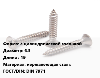 Саморез с цилиндрической головкой D=6.3 L=19 нержавеющая сталь ГОСТ: DIN 7971
