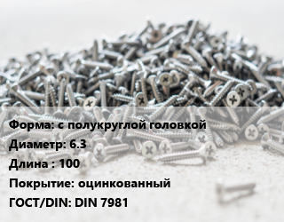Шуруп с полукруглой головкой 6.3х100 оцинкованный ГОСТ: DIN 7981, упаковка 1000 шт цена от 4 414 ₽ / кг, где купить, условия доставки в Туле и Тульской области
