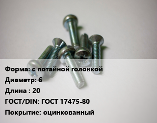 Винт с потайной головкой 6х20 ГОСТ 17475-80 оцинкованный, упаковка 1000 шт,упаковка 5 кг, кг цена от 257.67 ₽ / кг, где купить, условия доставки в Туле и Тульской области