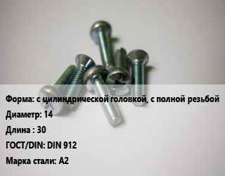 Винт с цилиндрической головкой, с полной резьбой 14х30 DIN 912 Сталь: А2, цена за шт, кг цена от 121.2 ₽ / кг, где купить, условия доставки в Туле и Тульской области