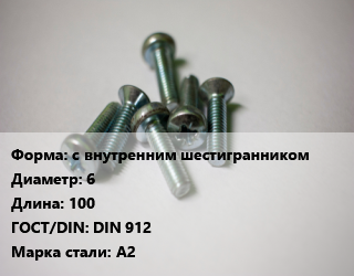 Винт с внутренним шестигранником 6х100 DIN 912 Сталь: A2, цена за шт, кг цена от 62.1 ₽ / кг, где купить, условия доставки в Туле и Тульской области