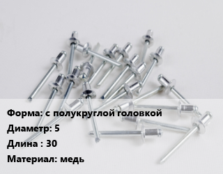 Заклепка с полукруглой головкой 5х30 медь, кг цена от 221.03 ₽ / шт, где купить, условия доставки в Туле и Тульской области