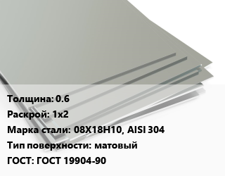 Лист нержавеющий 0.6 1х2 Сталь: 08Х18Н10, AISI 304 Тип:матовый ГОСТ 19904-90