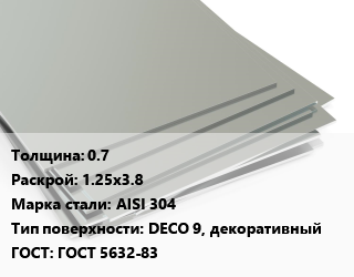 Лист нержавеющий 0.7 1.25х3.8 Сталь: AISI 304 Тип:DECO 9, декоративный ГОСТ 5632-83