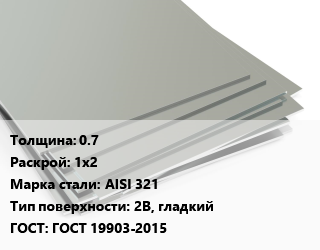 Лист нержавеющий 0.7 1х2 Сталь: AISI 321 Тип:2B, гладкий ГОСТ 19903-2015