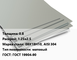 Лист нержавеющий 0.8 1.25х2.5 Сталь: 08Х18Н10, AISI 304 Тип:матовый ГОСТ 19904-90