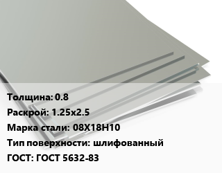 Лист нержавеющий 0.8 1.25х2.5 Сталь: 08Х18Н10 Тип:шлифованный ГОСТ 5632-83