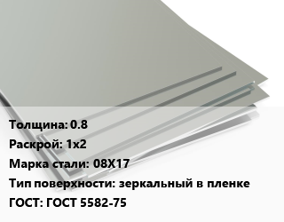 Лист нержавеющий 0.8 1х2 Сталь: 08Х17 Тип:зеркальный в пленке ГОСТ 5582-75