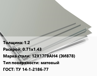 Лист нержавеющий 1.2 0.71х1.43 Сталь: 12Х17Г9АН4 (ЭИ878) Тип:матовый ТУ 14-1-2186-77 цена от 1 615 000 ₽ / т, где купить, условия доставки в Туле и Тульской области