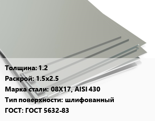 Лист нержавеющий 1.2 1.5х2.5 Сталь: 08Х17, AISI 430 Тип:шлифованный ГОСТ 5632-83