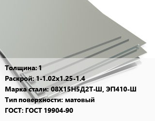 Лист нержавеющий 1 1-1.02х1.25-1.4 Сталь: 08Х15Н5Д2Т-Ш, ЭП410-Ш Тип:матовый ГОСТ 19904-90