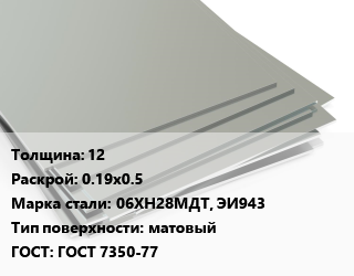 Лист нержавеющий 12 0.19х0.5 Сталь: 06ХН28МДТ, ЭИ943 Тип:матовый ГОСТ 7350-77