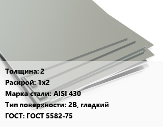 Лист нержавеющий 2 1х2 Сталь: AISI 430 Тип:2B, гладкий ГОСТ 5582-75