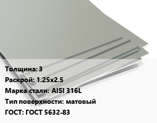 Лист нержавеющий 3 1.25х2.5 Сталь: AISI 316L Тип:матовый ГОСТ 5632-83