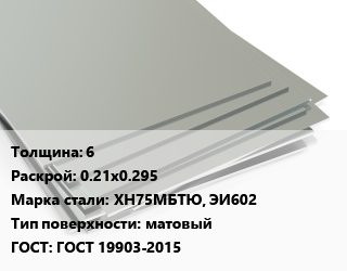 Лист нержавеющий 6 0.21х0.295 Сталь: ХН75МБТЮ, ЭИ602 Тип:матовый ГОСТ 19903-2015
